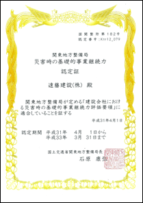 BCP認定(関東地方整備局 災害時の基礎的事業継続力認定)